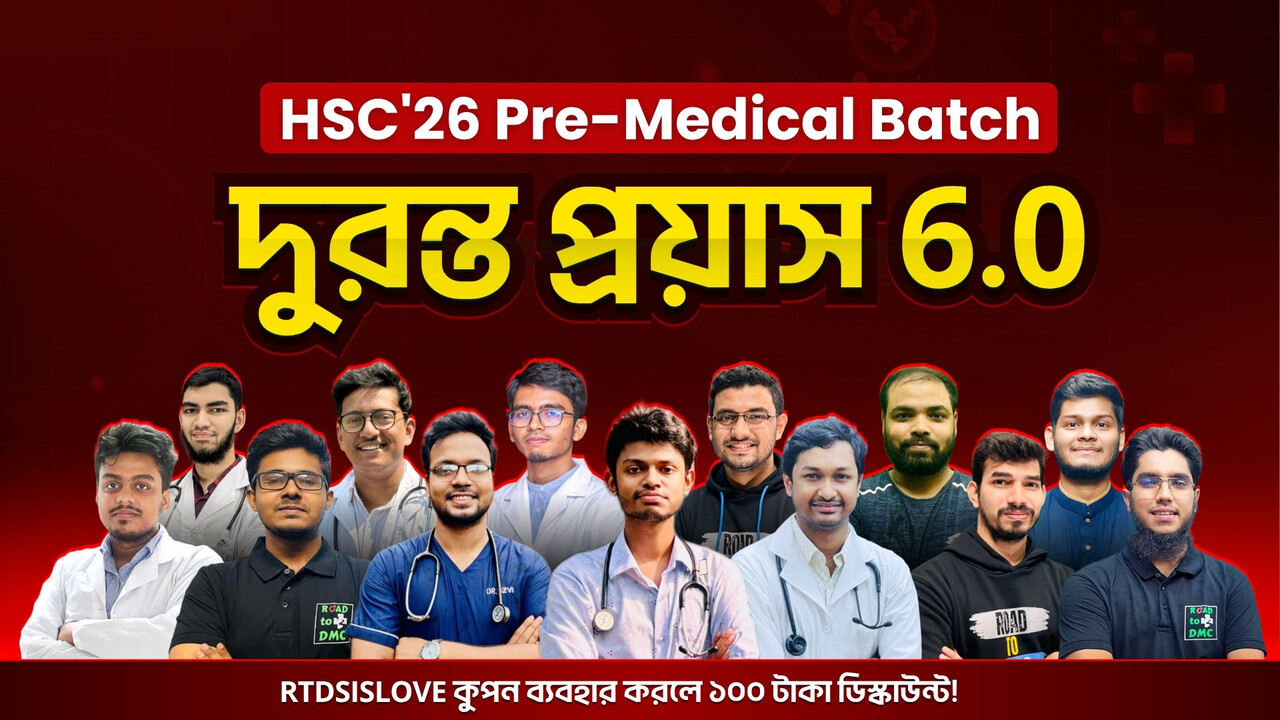 দুরন্ত প্রয়াস 6.0 | HSC'26 Pre-Medical Batch 🔥RTDSISLOVE কুপন ব্যবহার করলে ১০০ টাকা ডিস্কাউন্ট!HSC'26 | "Advanced Premedical" l🔶 কোর্সের ধরণ: Advanced Premedical+প্রিমেডিকেল + মেডিকেল ভর্তির সম্পূর্ণ কোর্স🕒 কোর্স ডিউরেশন: ২০২৬ সালের মেডিকেল ও ডেন্টাল ভর্তি পরীক্ষা শেষ হওয়া পর্যন্ত।📌 প্ল্যান:⏳ ৩ টি ফেইজে ভাগ করা হয়েছে:1️⃣ Advanced Premedical : Premedical Batch শুরুর আগে পর্যন্ত2️⃣ Pre-Medical Phase : HSC পরীক্ষার এক মাস আগ পর্যন্ত।3️⃣ Medical Admission Phase: HSC পরীক্ষার পর থেকে মেডিকেল ভর্তি পরীক্ষার আগ পর্যন্ত।📌২৬ ব্যাচের সবার জন্য না, যারা তীব্র মেডিকেল ড্রিমার তাদের জন্য। 📌ঈদের পর ক্লাস শুরু । 📌সপ্তাহে মাত্র ১ টি ক্লাস । 📌ভর্তি হলে এখন থেকেই ফুল সিলেবাস Archive ক্লাস দেখা যাবে।📌এই ব্যাচে যুক্ত হলে ২৬ এর প্রিমেডিকেল ব্যাচ, মেডিকেল ব্যাচ সব ফ্রি থাকবে। আর কোনো কোর্সে যুক্ত হতে হবে না। একবারই পেমেন্ট। 📌কোর্স চলবে ২৬ ব্যাচের মেডিকেল ও ডেন্টাল পরীক্ষার আগ পর্যন্ত। 📌২৬ ব্যাচ হয়ে ২৫ এর প্রিমেডিকেল ব্যাচে কাউকে যুক্ত করা হবে না। হতে চাইলে এটায় হও।⛔ ক্লাস শুরু: April 1st Week , ২০২৫Advanced Premedical-এ যা যা পাচ্ছো:🔴 ক্লাস এবং বই: 📚 মেডিকেল উপযোগী 15টি সেরা বই (GK এবং ইংলিশ সহ) (Materials Payment আলাদা )💻 250+ ফেসবুক লাইভ ক্লাস🖥️ Dedicated Website এবং Web App-এ ক্লাস আর্কাইভ🔴 স্পেশাল ফিচারস:✅ আর্কাইভ ক্লাস (Web App)✅ শিক্ষকদের দাগানো বইয়ের এক্সক্লুসিভ পিডিএফ ✅ Personal Mentorship ✅ Special Rapid Fire 🔥 ✅ Website Unlimited Doubt Solve✅ কঠিন টপিক শেখানোর জন্য 3D Animation ✅ গুরুত্বপূর্ণ বইয়ের অনুশীলনী Solve ক্লাস ✅ অভিজ্ঞ ডিএমসিয়ান শিক্ষক প্যানেল🔴 পরীক্ষা:✍️ Daily Exam📖 Chapterwise Test🎯 Competitive Review Exam💥 Unlimited অনুশীলনী Exam📜 Paper Final, Subject Final, Model Test✔️ প্রতিটি পরীক্ষার উত্তর এবং ব্যাখ্যা পাওয়া যাবে সাথে সাথেই। ✔️ নেগেটিভ মার্কিংসহ পরীক্ষা। ✔️ রিভিউ পরীক্ষায় থাকবে উৎসাহমূলক পুরস্কার।💰 কোর্স ফি:⚡ প্রথম ৫০০ জনের জন্য ডিসকাউন্টেড ফি: ৫৯৫০/- টাকা (বই/ম্যাটেরিয়ালস ছাড়া)"RTDSISLOVE" Coupon ব্যবহার করলে আরো ১০০ টাকা ডিসকাউন্ট পাবে !📖 ম্যাটেরিয়ালসের ন্যূনতম খরচ আলাদা (ঐচ্ছিক)।ম্যাটেরিয়ালস এর ন্যূনতম খরচ, সেটা পরবর্তীতে নেয়া হবে (এটি অপশনাল, কেউ বই নিতে না চাইলে এক্সট্রা কোনো খরচ নাই।)কোর্সটি কেন ভালো হবে?🌟 Advanced Premedical-এর শিক্ষক প্যানেল:যারা এখানে ক্লাস নিবেন সবাই দীর্ঘ সময় ধরে পড়াচ্ছেন। সকলেই পরীক্ষিত সফল শিক্ষক🏆🏆। কিভাবে মেডিকেল ভর্তি পরীক্ষায় টপ করতে এবং করাতে হয় সেটি খুব ভালো করেই জানেন এই টিচার প্যানেল।💪 আমাদের পক্ষ থেকে সর্বোচ্চ চেষ্টা করা হবে। বাকিটা তোমার ইচ্ছা এবং একাগ্রতার উপর!⚙️ ভর্তি প্রক্রিয়া:🔗 আমাদের ওয়েবসাইটে ভর্তি হতে হবে: 🌐 www.rtdslive.com📲 Chrome Browser-এ সার্চ করো: www.rtdslive.com💡 বিস্তারিত প্রক্রিয়া জানতে কমেন্টে ভিডিও দেওয়া আছে।যোগাযোগের জন্য:📩 পেইজে ম্যাসেজ করো (সবচেয়ে ভালো উপায় 🥇)📞 কল/হোয়াটসঅ্যাপ:01724925752 (